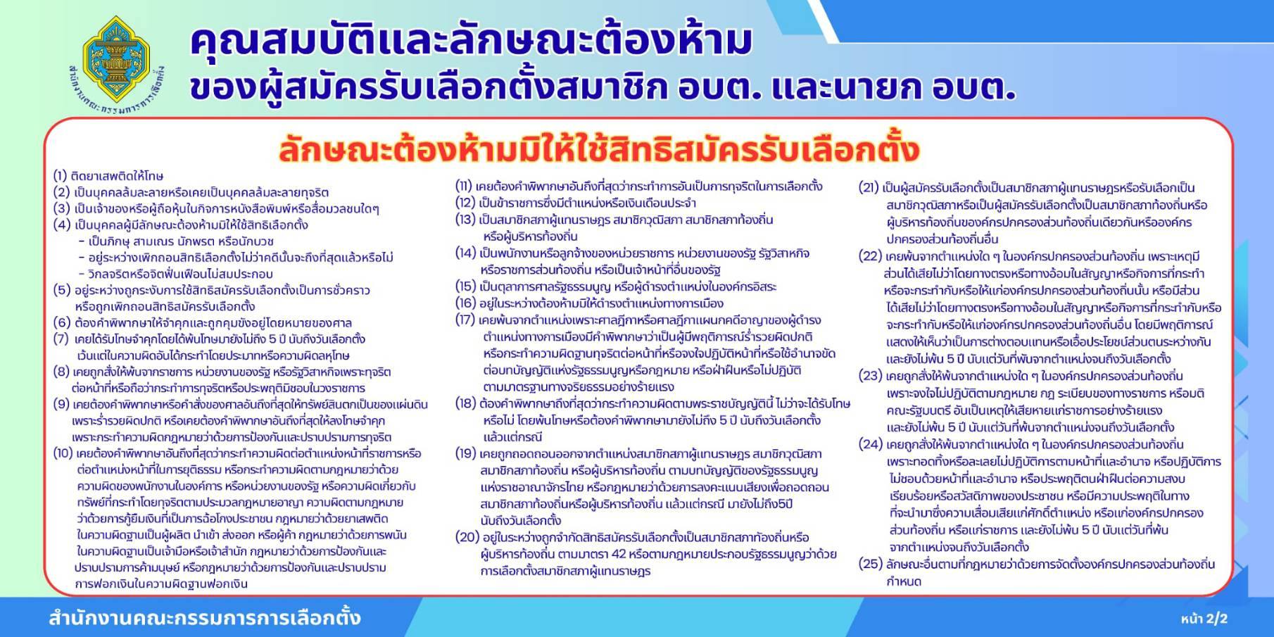 วันที่ ๖ ตุลาคม ๒๕๖๘ องค์การบริหารส่วนตำบลสะอาดสมบรณ์ประชาสัมพันธ์คุณสมบัติและลักษณะต้องห้ามของผู้สมัครรับเลือกตั้งสมาชิกสภาองค์การบริหารส่วนตำบลและนายกองค์การบริหารส่วนตำบล